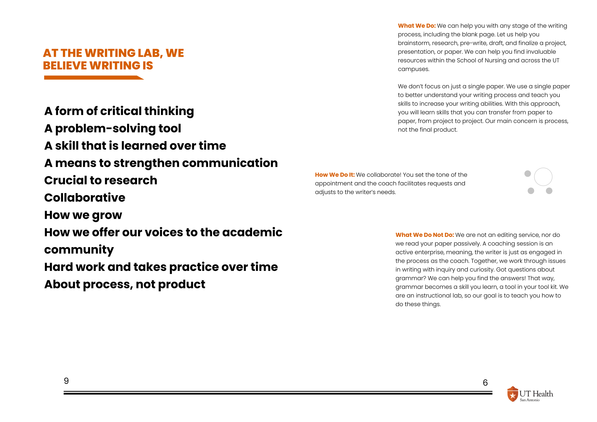 Collaboration: Inkos collaborated with one co-author to write the brochure copy based on a written wish list and verbal descriptions from the Writing Lab director. The co-author and I used both divide-and-conquer and unite-and-build drafting strategies. We required the director to submit data and testimonials for us to edit and format. Upon drafting completion, Inkos designed the brochure using a Figma Community template.